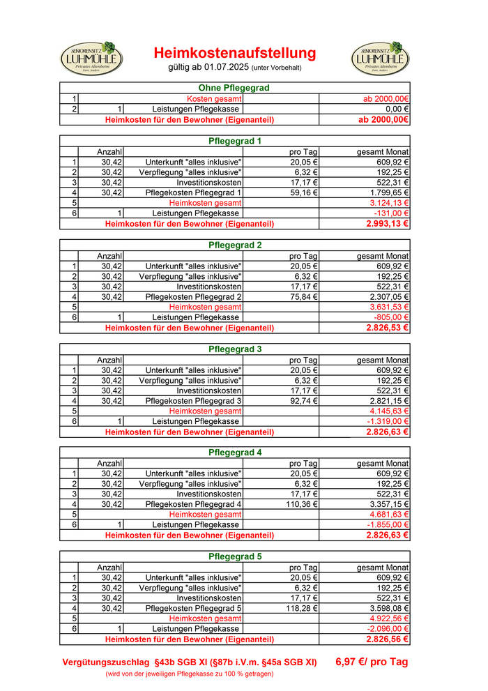 Unsere Heimkosten ab 01.07.2025